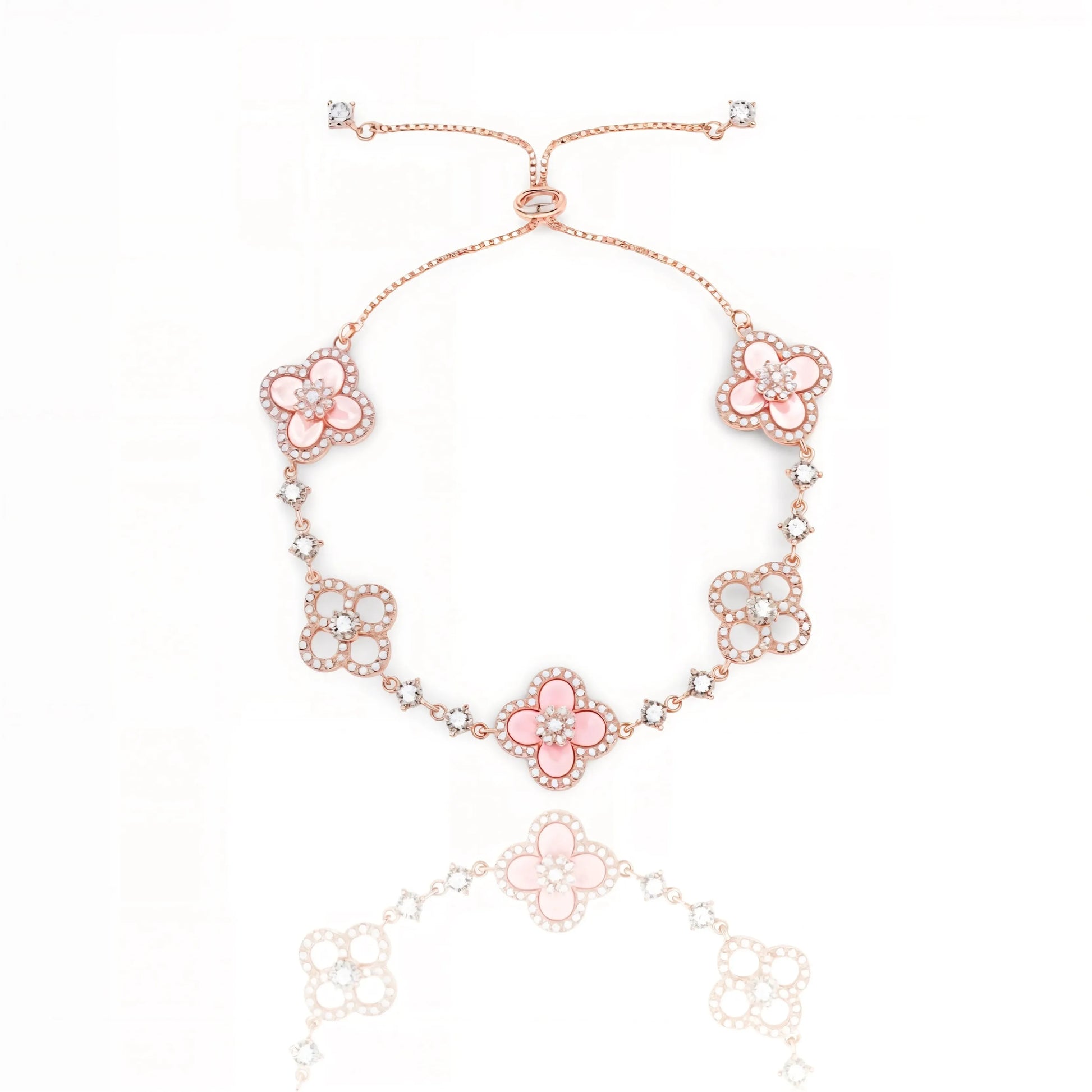 The Sakura Cleef Bracelet blends floral grace with sparkling energy, symbolizing love, luck, and feminine strength. Fully adjustable size featuring 5A+ diamond-cut cubic zirconia, each sakura-shaped stone glimmers beautifully.